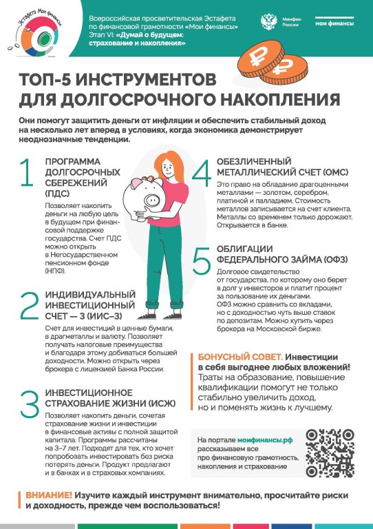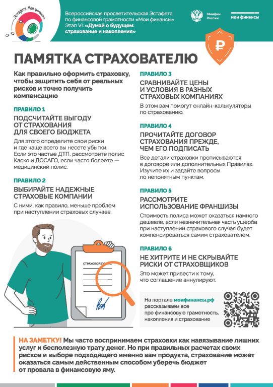 С 8 сентября по 15 ноября 2025 года проводится шестой этап Всероссийской просветительской Эстафеты «Мои финансы». Тема данного этапа «Думай о будущем. Страхование и накопление».